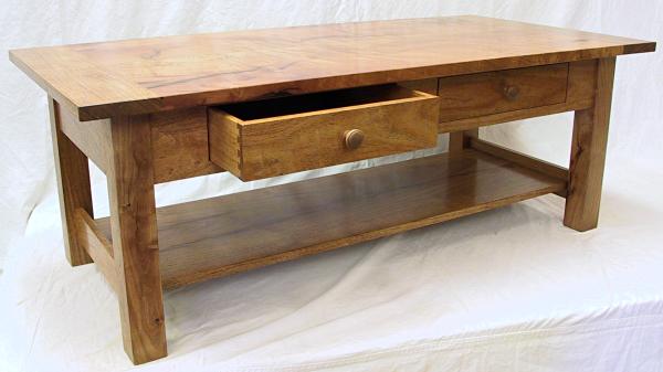 The photos below show the construction of a Craftsman style mesquite coffee table. The table will be 53" long, 26" wide, and 19" high. The top will be made from two 13" wide boards, the bottom shelf is a single 15" wide board. Mesquite has many cracks and voids that I fill with West brand epoxy that is tinted black. The table legs have the mortises cut for the side rails. The remaining pieces are milled to size and are ready for the joinery. Move the mouse pointer over the photo for the table part names.